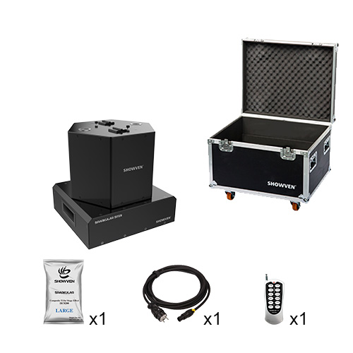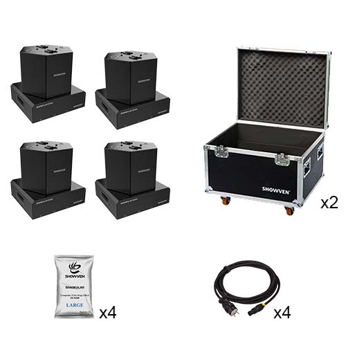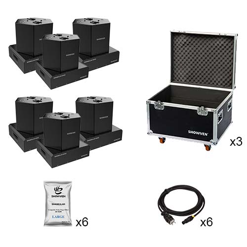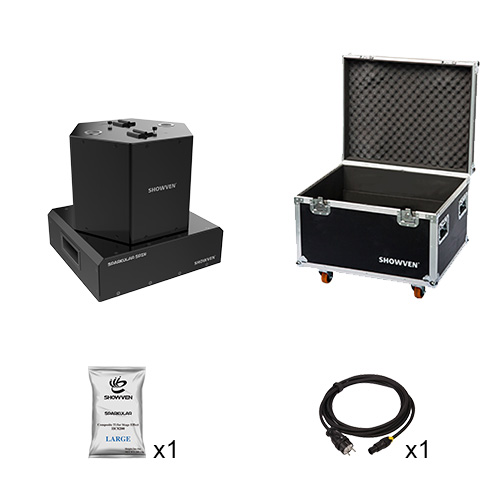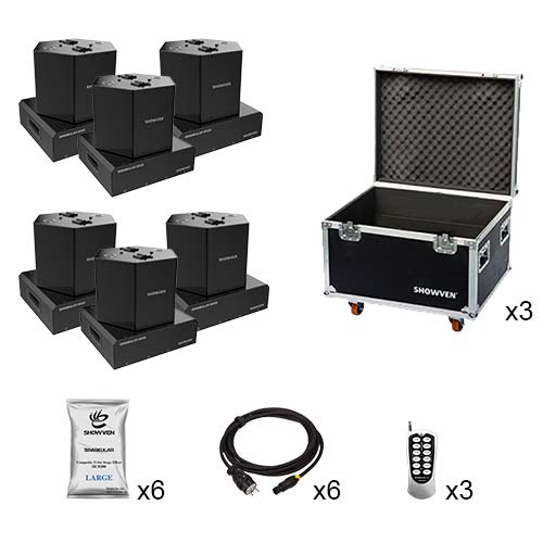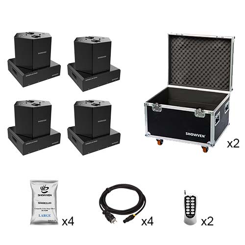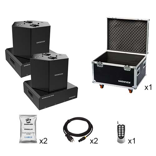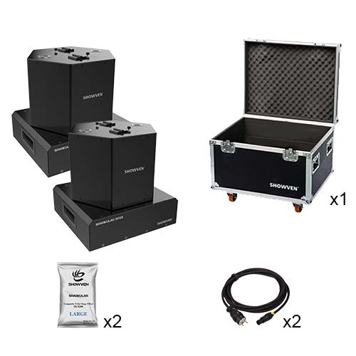 A flight case for transporting 2 units is included. This model is also sold in sets of 2, 4 and 6 machines with DMX cable and flight case included.
