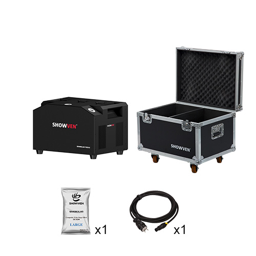 An optional flight case is available for transport. This model is also sold in sets of 2, 4 and 6 machines with DMX cable and flight case included.