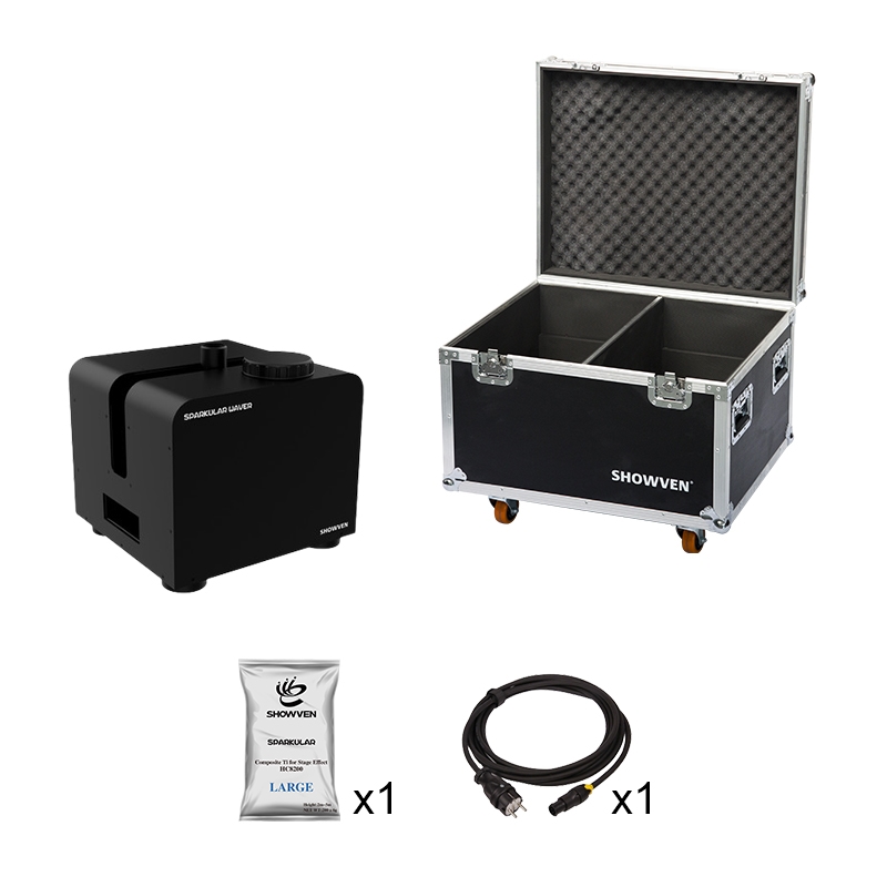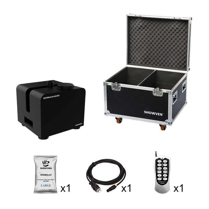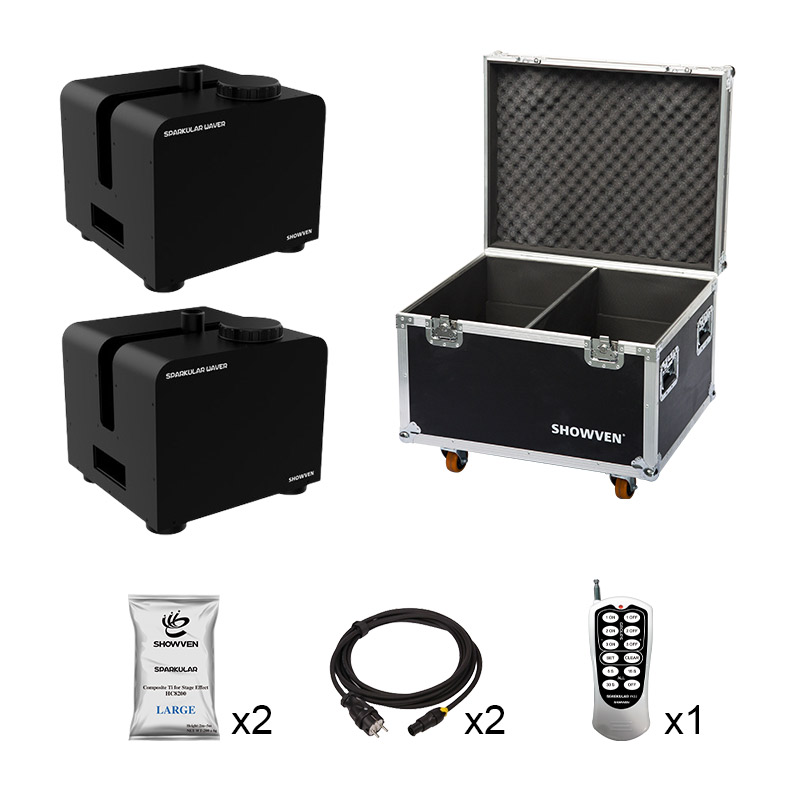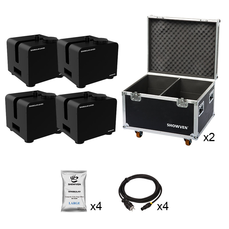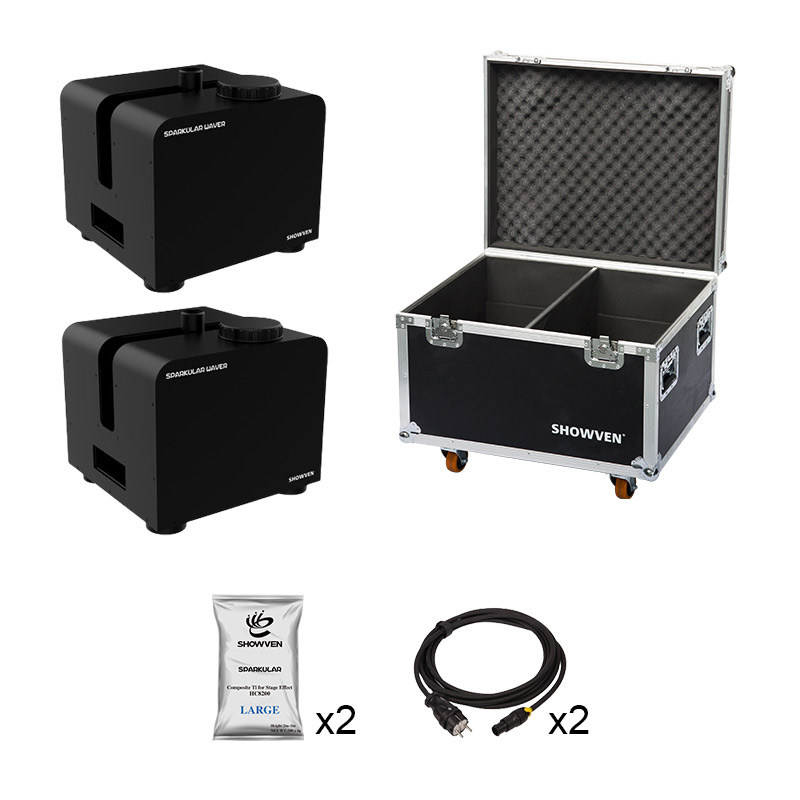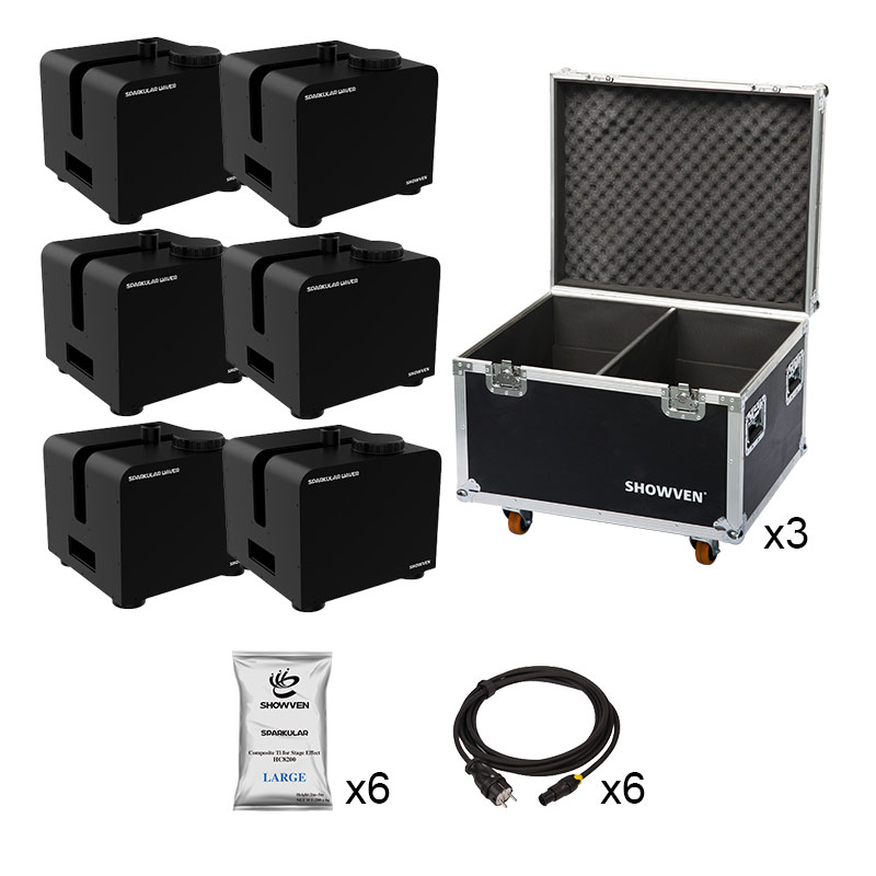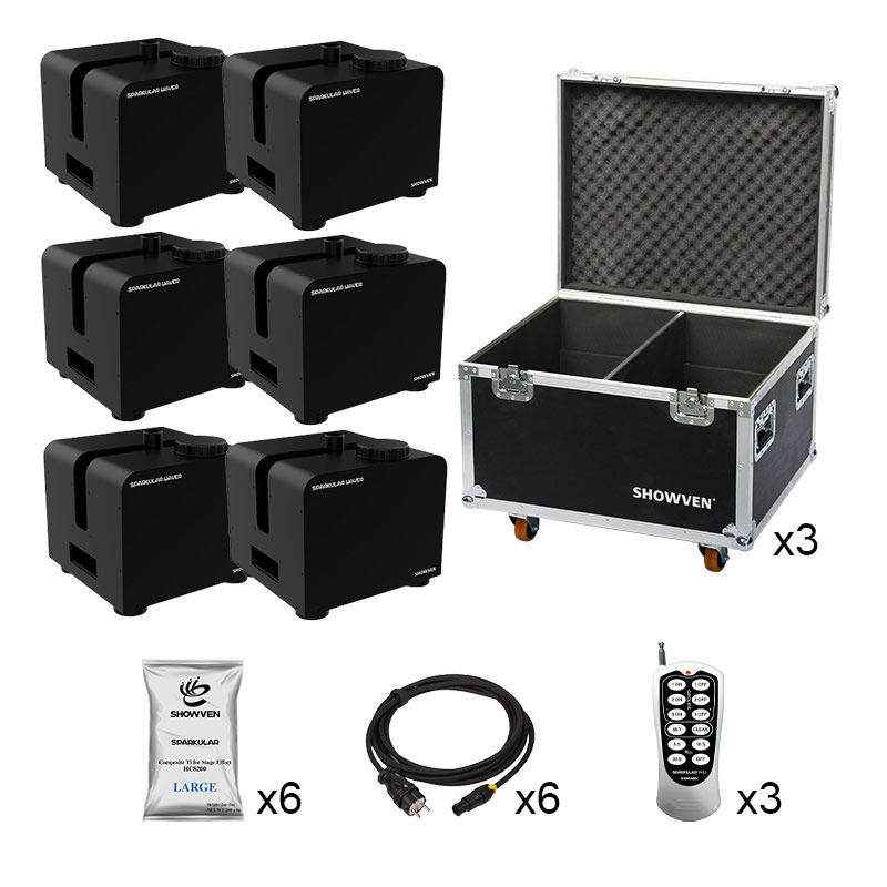 This cold spark machine is also sold in packs of 2, 4 and 6 machines, with power cables and flight case included.