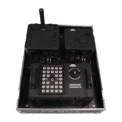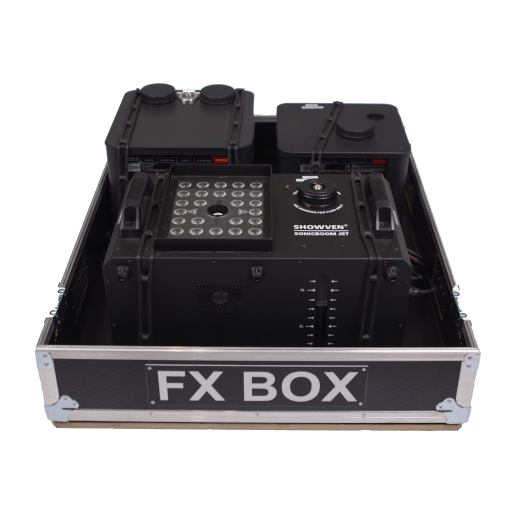 Flightcase professionnel pouvant accueillir jusqu’à 3 machines, la SFX BOX permet une mise en place rapide et efficace : positionnez, connectez (PowerCON + DMX en façade), et l’installation est prête.