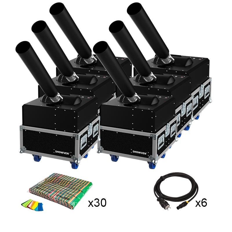 Le tube de sortie peut contenir jusqu’à 10L de confettis ou serpentins et peut être orienté de -27° à -41°. Le réservoir d’air comprimé de 36L supporte jusqu’à 8bar de pression.